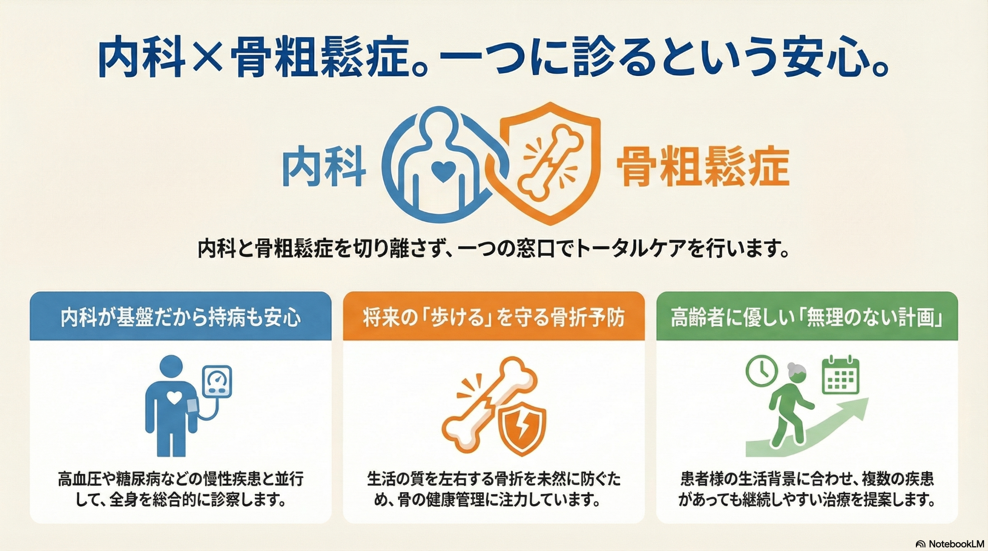 地域の皆様が健康で自立した生活を長く続けられるよう、内科としてできる最大限の骨粗鬆症医療を提供してまいります。