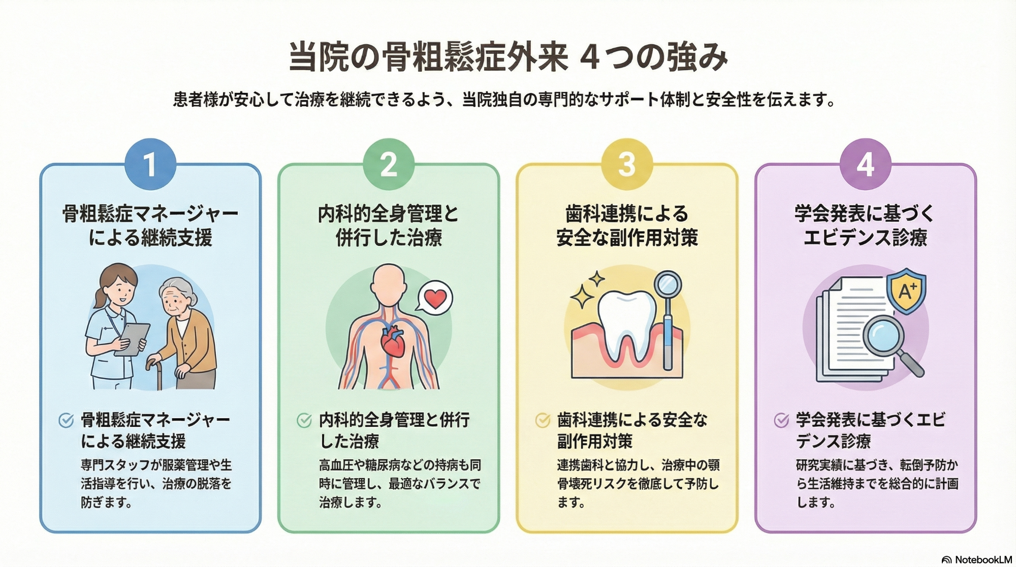 当院では骨粗鬆症マネージャーが在籍し、服薬管理・生活指導・通院継続をサポートします。